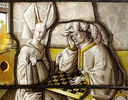Les jeux dont on pense savoir à quoi ils correspondent sont des jeux qui ont été joué des siècles plus tard comme le trictrac/backgammon ou les échecs. De pierres sculptées (jeux du serpent ou Mehen) à de magnifiques jeux en marqueterie ou verre, de vitraux à des illustrations d’ouvrages, on se ballade à travers le temps, à la découverte des rois, des interdits et des plaisirs.L’église interdisait les jeux de hasard et avait même promulgué une loi interdisant les dés. Dans le vitrail ci-dessous, on assiste à une partie qui semblerait d’échec entre une femme mariée (sa coiffe) et un chevalier. On assiste à une scène d’amour courtois. On ne se mariait pas par amour au moyen-âge, alors la question du sentiment se faisait avec des chevaliers de passage. L’amour avait pour but de rendre plus humain et plus gentil les chevaliers qui étaient de vaillant et sanglant combatant. La femme fait du pied pour le séduire.