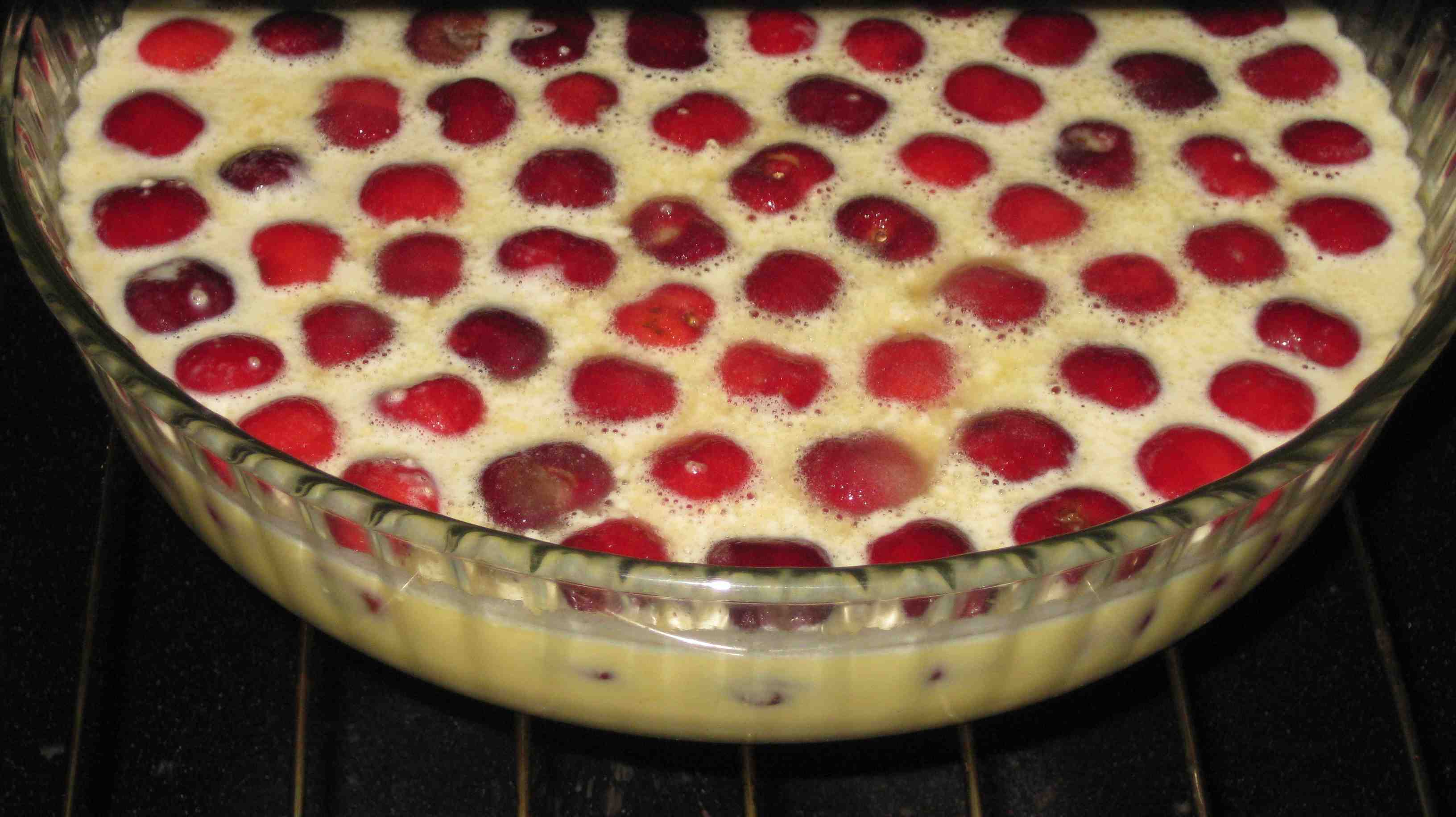 Versez ce mélange sur les cerises dans le moule, mettez au four préchauffé à 220° pendant une vingtaine de minutes. (30 éventuellement). Le cake a la consistance d’un flan et doit être doré sur les côtés. Je ne regarde jamais l’heure, quand c’est doré, je retire !