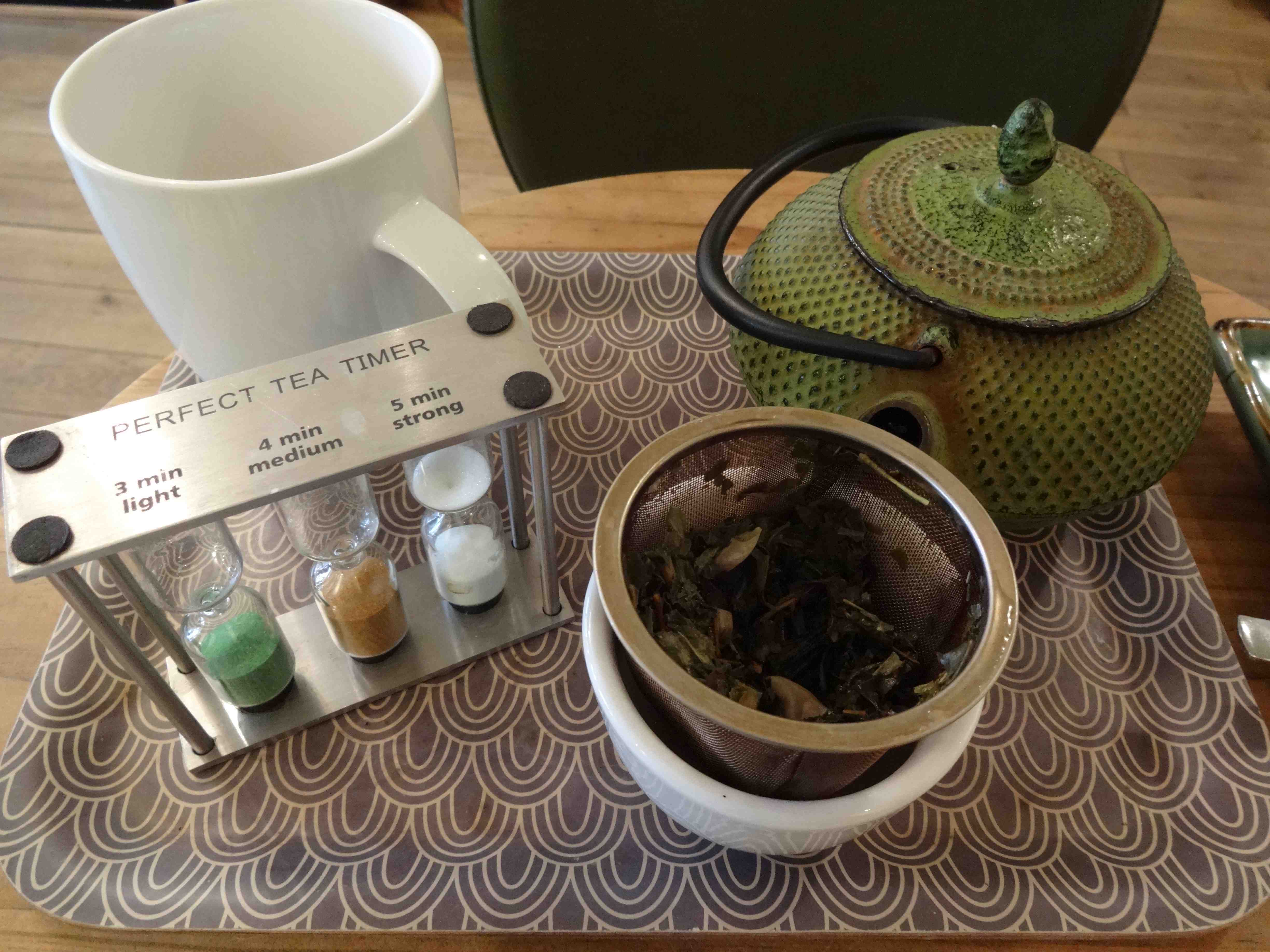 J’ai apprécié le petit plateau avec une tasse, une théière, un support pour déposer mon infuseur et surtout le sablier. Un sablier qui vous permet de choisir si vous voulez votre thé, léger, normal ou fort. C’est une très bonne idée. Quelque chose qui fait pro. que l’on ne retrouve pas chez Laduré par exemple.