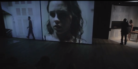 Les comédiens sont dans l’histoire. Ils ne jouent pas, ils la vivent aussi bien dans l’amour, dans la haine, la colère ou la souffrance. A aucun moment, on ne doute de la sincérité de ces derniers. Ils se donnent corps et âme. D’ailleurs, on oublie presque que se sont des comédiens. Presque, car l’histoire ne se déroule pas simplement sur la scène. L’espace de la salle 400 du 104, est très grande et permet d’accueillir un système d’écran, de projections et des décors importants. Le spectacle mélange des scènes tournées et enregistrées, des scènes tournées en direct et le jeux des comédiens sur scène. Le caméraman est présent presque tous le temps, il est à l’intérieur du spectacle et devient spectateur à la fois. Parfois, il s’assied et regarde ce qu’il se passe. D’autre, il demande de refaire un geste pour le filmer. Parfois, nous savons ce qui se passe derrière un décor, nous ne pouvons voir ce qu’il se passe que par la projection sur les écrans. Nous devons spectateur voyeur.