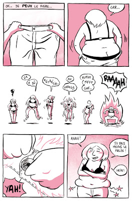 Une bande dessinée qui se lit bien avec un choix de couleur légèrement surprenant. En effet, le noir côtoie le rose, ouf c’est une bd pour fille. Il est intéressant de plonger dans la vision d’une femme ronde d’elle et de son quotidien. On peut se retrouver facilement dans cette femme qui se sent mal dans son corps. Il est bien aussi de voir aussi des images de femmes qui ont dépassé le 38 depuis très longtemps. Alors mesdames, mesdames un peu de gras dans vos lectures.
