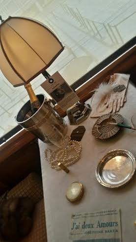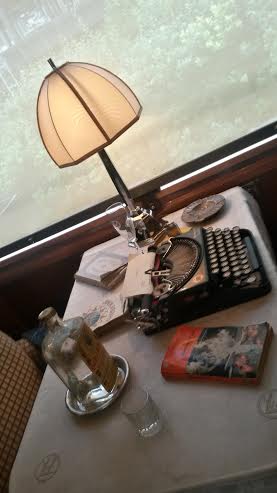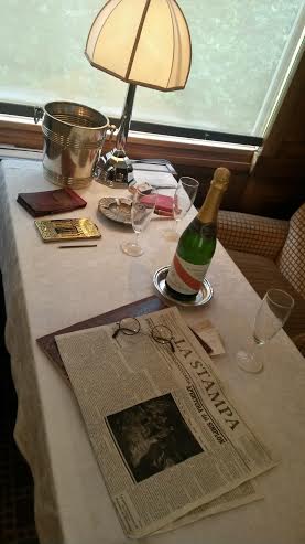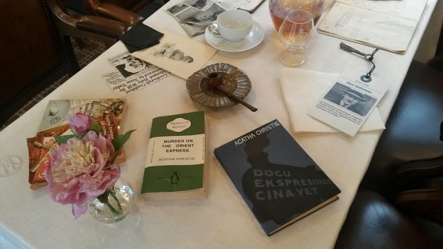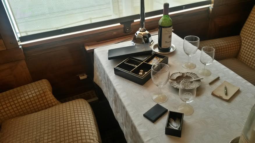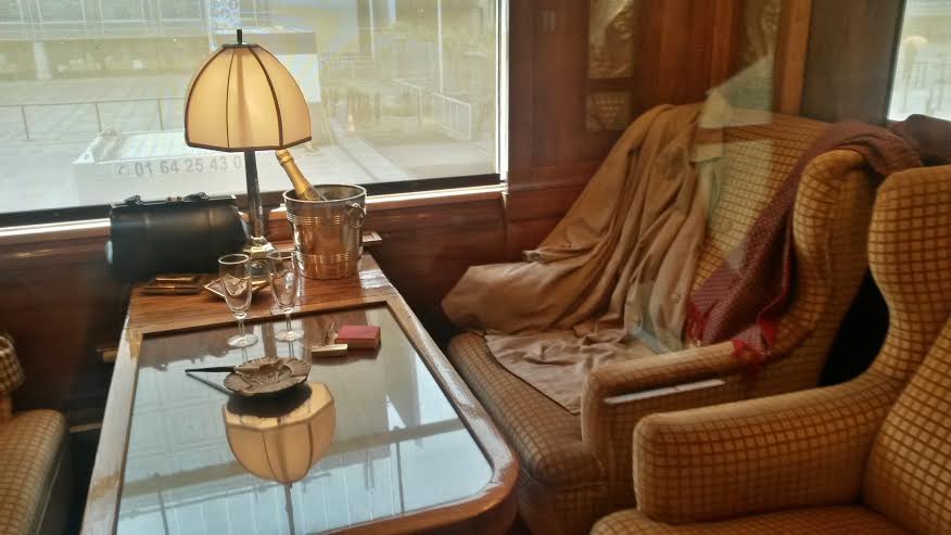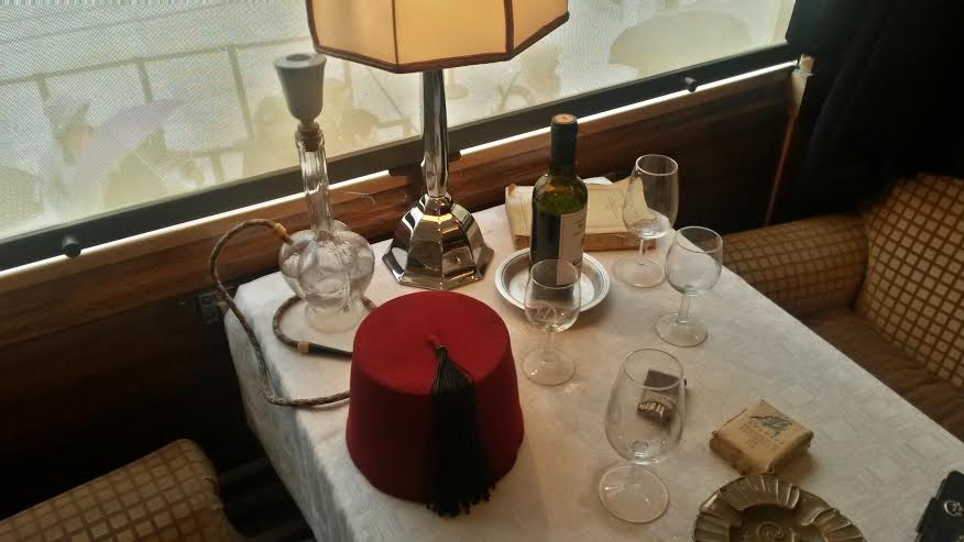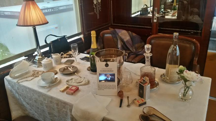 Sur les tables se trouvent des objets qui auraient pu figurer dans la période de circulation du train et aussi ceux qui font partie de la construction de la renommée du train. On trouve la pipe d’Hercule Poirot, du champagne Mum, le monogramme de l’Orient Express sur les nappes… Des petits cartels donnent des explications sur des personnalités ayant utilisé le train comme Pierre Lotti, Joséphine Baker, Agatha Christie…