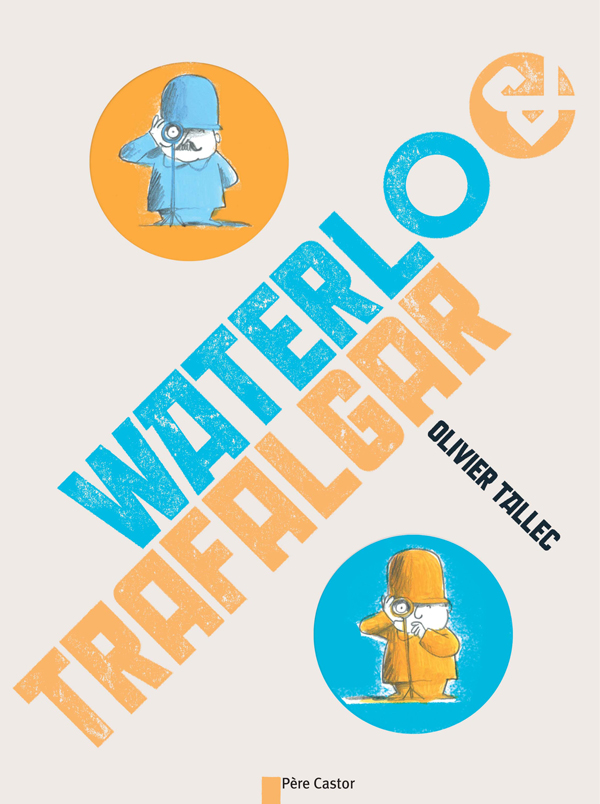 Sur la couverture un petit rond en haut à gauche avec un petit homme bleu sur fond orange puis en bas à droite, un petit rond avec un petit homme orange dans un fond bleu. Les deux hommes une lunette à l’oeil nous observe où s’observe car le titre Waterloo et Trafalgar n’est pas sans rappeler des anciens cours d’Histoire.