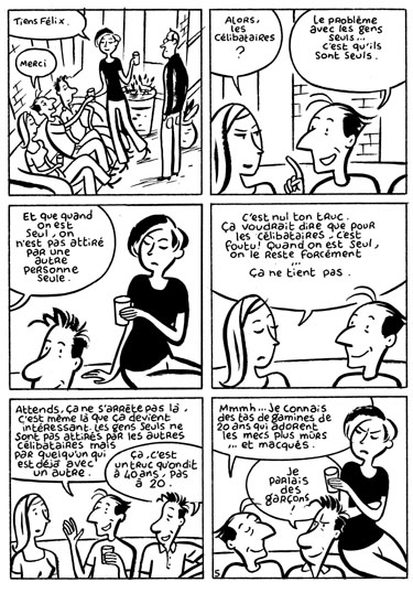 Cet album est une transition entre le milieu du troisième volume (Les femmes et les enfants d’abord) et le début du quatrième (Vivons heureux sans en avoir l’air). Mais si vous ne connaissez pas la série, ni n’avez lu tous les tomes, ce n’est pas très important. Il peut se lire tout seul. De toute façon, Jean est une homme ordinaire qui a connu le succès après la publication d’un de ces livres. Il doit retrouver l’inspiration mais elle ne se trouve pas partout malheureusement. En plus, il a des amis et tous ne sont pas très fréquentable, c’est surtout le cas de Félix. Ce dernier, n’arrête pas de hurler sur les couples, pense que l’amour n’est qu’un mensonge et se comporte de façon odieuse en général. La délicatesse n’est pas mot inventé pour lui, car il ne se fait même pas discret quand son pote séduit une femme.
