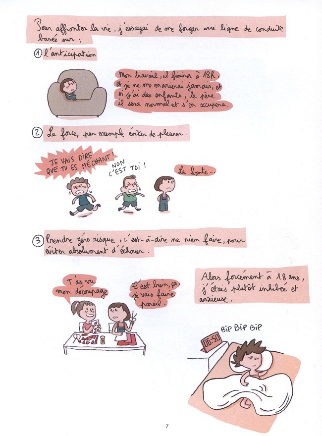 Pénélope Bagieu qui dirigeait une collection chez l’éditeur Jean-Claude Gawsewitch, qui lui a donné sa chance dans le milieu, décide de soutenir les jeunes artistes. Leslie Plée a décidé de suivre sa passion pour le dessin en entrant dans une école d’art appliquée à Sainte-Etienne. Le diplome en main, la question de l’avenir se pose. Que faire, surtout lorsqu’on n’a pas confiance en soi. On doit faire avec et partager ces peurs pour évoluer et réfléchir sur ces dernières. Leslie Plée partage les peurs qu’elle a depuis son plus jeune âge que cela soit celui des espaces clos ou soit celle des lieux avec beaucoup de gens, inconnus ou pas.