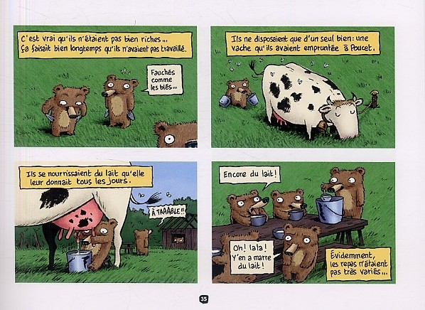 Tout d’abord, cette bande dessinée jeunesse destinée à un public de premiers lecteurs est un recueil de trois livres : Boucle d’or et les sept ours nains (2004), La Faim des sept ours nains (2005) et La Belles aux ours nains (2009). Le type évoque tout autre chose. C’est fait exprès pour annoncer de façon honnête ce qu’il va nous être raconter. Les sept petits ours sont fainéants et gourmands, le chat botté va se faire adopter par le petit chaperon rouge, les princesses qui ne trouve pas de princes vont finir en femme de ménage, les enfants de la maison en pain d’épices vont se transformer au délicieux goûter pour loup affamé.