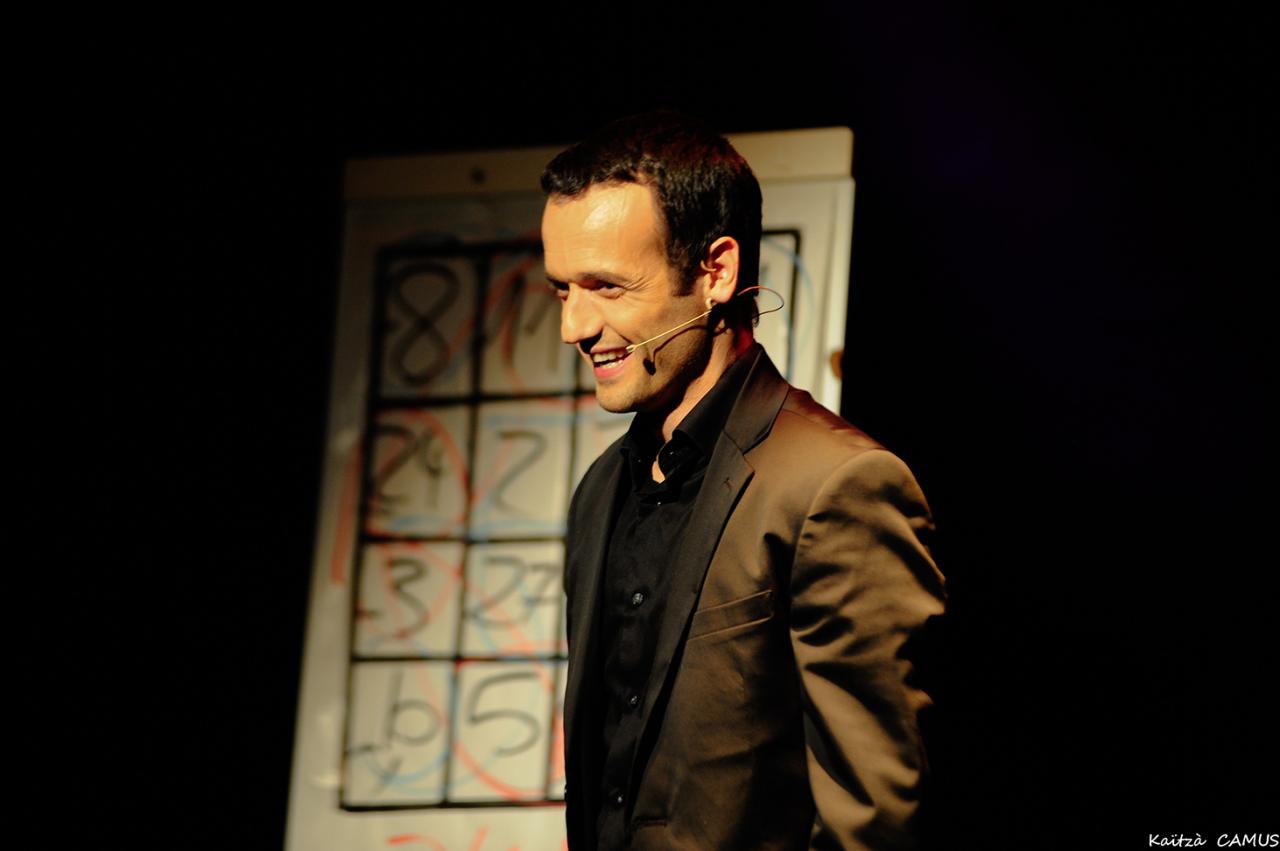 Tout jeune, il a développé une compétence : l’hypermnésie. Cette capacité de tout retenir l’aide forcément au jeux du dictionnaire. Il connait tous les noms et mise en page. C’est toujours bluffant à voir. Tout comme le fait qu’il puisse très très vite de tête de faire des calculs mentaux et compléter en 20 secondes un sudoku en faisant dans tous les sens le même résultat sur toutes les lignes. Ou encore qu’il arrive à deviner à quel film vous pensez ou qu’elle carte vous avez pioché. Le tout fait avec une grande pédagogie où il fait participer le public en expliquant les trucs pour nous faire croire que nous aussi on peut réussir à le faire.
