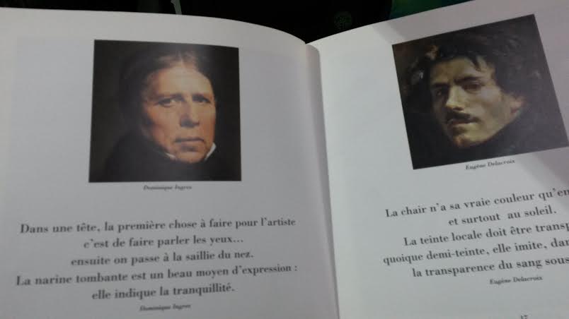 Le livre débute avec une citation de Pline l’Ancien : C’est Lysistrate qui instaura la pratique de rendre la ressemblance; avant lui, on s’appliquait à faire les visages aussi beaux que possible. Voilà, le ton est donné on peut tourner les pages pour découvrir des autoportraits et des citations. Alors au détour d’une lecture, on découvre les trains multicolores de Vincent Van Gogh, les traits au crayon noir de Léonard de Vinci et Pieter Bruegel, les traits allégés d’Henri Matisse ou l’intensité du classicisme de Diego Velasquez. Et puis les artistes réfléchissent aussi à leur représentation comment bien rendre la réalité. La chair n’a sa vraie couleur qu’en plein air et surtout au soleil. La teinte locale doit être transparente; quoique demi-teinte, elle imite, dans le principe, la transparence du sang sous la peau. Sacré Eugène Delacroix.