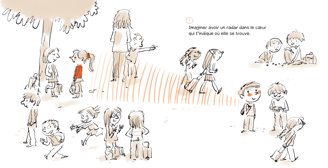 Il s’imagine qu’un radar dans son coeur perçoit où elle se trouve, rêve qu’il remporte la coupe du monde et lui dédie sa victoire, se met derrière elle pour deviner le parfum de son shampoing…Elle s’imagine que son coeur émet des signaux pour lui dire où elle se trouve, rêve qu’il remporte la coupe du monde et lui dédie sa victoire, change sans arrêt de shampoing pour deviner le parfum qu’il préfère… Côté garçon, côté fille, c’est (presque) pareil. Sauf quand ils se retrouvent face à face au milieu de ce livre tête-bêche : c’est elle fait le premier pas !