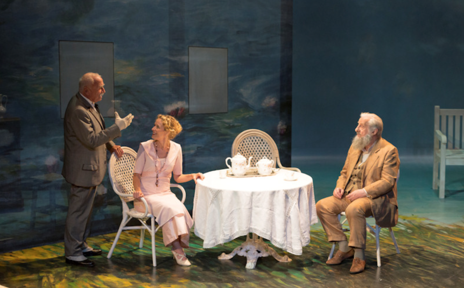 Pour raconter cette aventure, Christophe Lidon a créé une mise en scène tout en délicatesse avec une parfaite correspondance à l’histoire. Les deux hommes passionnés du Japon aussi bien par leurs arts ou leur philosophie de vie. Ainsi on voir sur toile de fond sont projetés numériquement des ambiances dont ces fameux poissons cerf-volant qui font beaucoup de bruits au vent fort. Tout comme les magnifiques toiles des Nymphéas ou des carpes koïs qui apparaissent au gré des actions et du temps qui passe. Il faut peu de choses pour signaler l’espace au final, quelques arbres magnifiquement peints, quelques chaises, un espace délimité de toiles semi-transparentes et nous voici dans un jardin. Bien entendu, il faut le talent de création pour donner l’impression de simplicité, indéniablement.