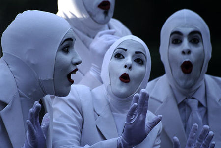 Les Voca People sont très reconnaissables à leur tenue assez inimitable. Heureusement d’ailleurs. Surement inspirés des Daft Punk et de Kiss, ces artistes cachent leur identité sous un costume largement inspiré d’un suppositoire, d’un préservatif et d’un tic-tac. Ils sont tout de blanc vêtus avec juste un rouge à lèvres. Et pour justifier cet accoutrement, une bonne excuse, et oui, ce sont des extraterrestres. Alors ainsi ils peuvent s’habiller étrangement et aussi parler plus du genre entre des bruits et la langue des snorky. Toutefois, on comprend le sens des mots par la gestuelle qui en découle. Puis quand même on vient écouter des chants.