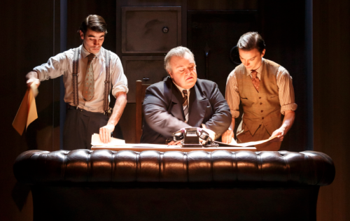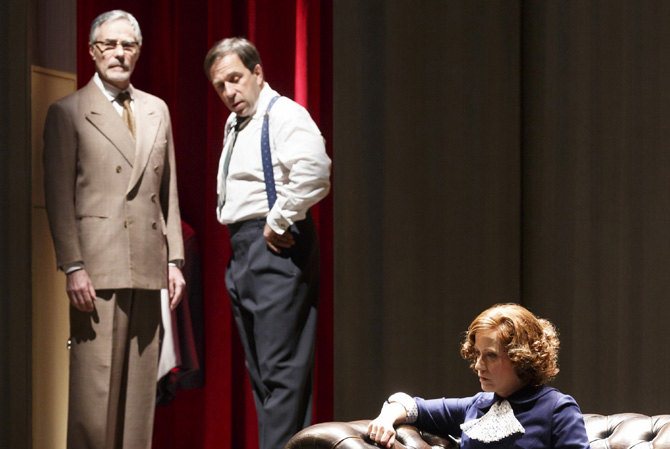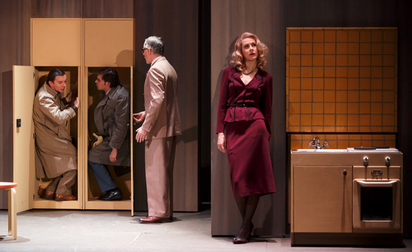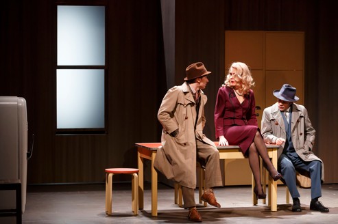 Ce qui m’a vraiment plu c’est la mise en scène et la mise en lumière. Lilo Baur a choisi de monter la version initiale de l’auteur, plus subversif où le maffieux Alessandrovici est présent. La structure du récit a orienté la metteuse en scène vers une esthétique cinématographique proche des films noirs. Par exemple, on trouve un trio amoureux avec la femme-mère, la femme putain et le mari/amant. Les décors tout en sobriété sont d’une efficacité incroyable. La scènographie d’Oria est surprenante tout comme le travail de lumière Gwendal Malard. Ces zones de lumières projetant des ombres, j’ai été totalement subjuguée par leur efficacité et leur magnificence. J’étais plongée dans un véritable film des années 50 avec ces lumières, ces costumes et la posture drôlement sexy de Florence Viala qui a pris un petit accent bien particulier.
