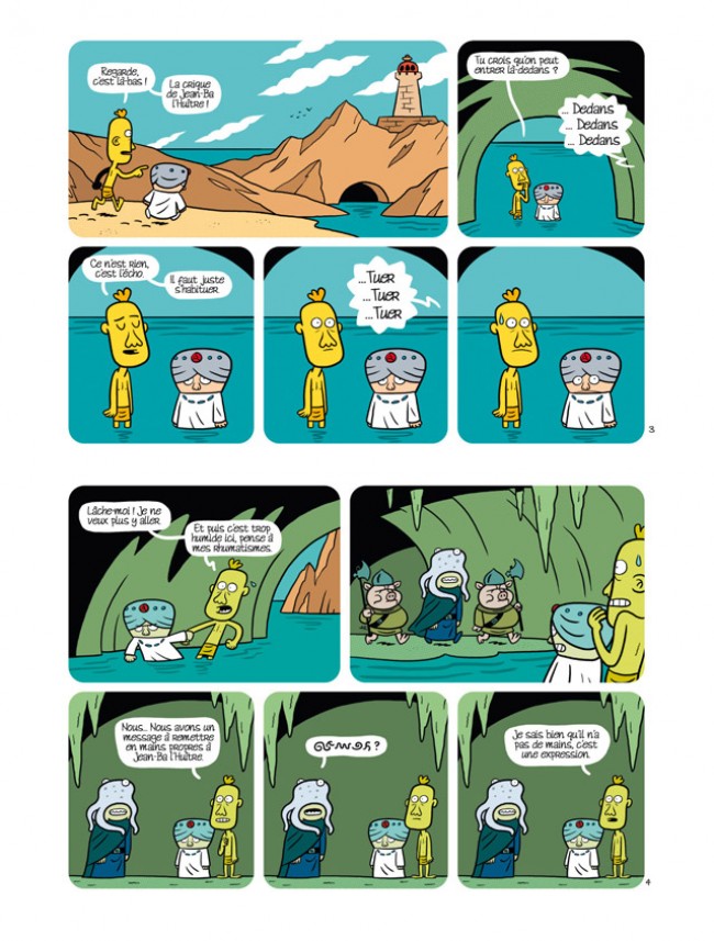 Alors on va rencontrer Jabba le Hutt, ici renommé Jean-Ba l’huître qui va avoir comme esclave la princesse Leica. Comme elle va en avoir marre, elle va le bouffer tout cru. Puis elle va aller en quête pour aller détruire le castel noire où vit le méchant Seigneur Salvador. Aider de son frère Jean-Luc Haut-le-coeur et de son amoureux Yann Kersolo avec la bande de potes habituels : Spéléo, le druide, Ravi-Ravi (R2), Aldo l’Arménien et Méchoui, ils vont détruire l’empire du mal. Blagues potaches et lourdes (trop) se succèdent pour tourner en dérision l’univers riche et varié des films. Peut-être que cela devait être drôle mais je m’exaspère et le dessin souligne ce désespoir.