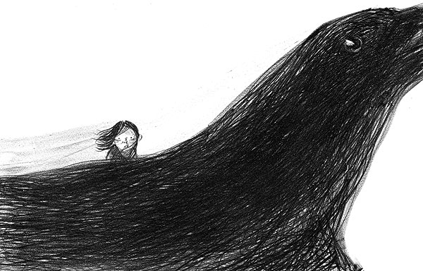 Un livre avec un dessin direct et efficace qui ne cherche aucune fioriture. La jeune fille au visage poupon accompagné de son chien vivent une aventure tout en rêverie et en espoir. Une jolie histoire même si j’aurais aimé un dessin plus léché ou avec des couleurs. C’est l’influence du travail d’Antoine Guilloppé et de ses dessins de corbeaux qui m’ont certainement influencé. J’ai aimé le dessin de la petit fille volant sur le dos de l’animal sur plusieurs pages où c’est juste le trait direct du crayon brut qui donne l’impression du mouvement.