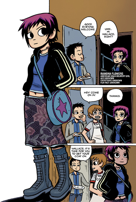 Scott vit toujours avec son pote dans un petit appartement. Il n’a pas de boulot mais pratique toujours la musique avec son groupe. Comme il est vraiment amoureux de Ramona, il va falloir qu’il fasse ces preuves. D’ailleurs, il va lui faire la cuisine à son domicile. Il va gagner un bon point même si il vit dans un appart qui craint. Avec un peu de peur, il va affronter le deuxième amoureux de Ramona même si aucun véritable combat va être fait contrairement au tome 1. Toutefois, il va gagner parce qu’il est malin ce petit jeune sans avenir et qu’est-ce que l’on n’est pas prêt à faire par amour?