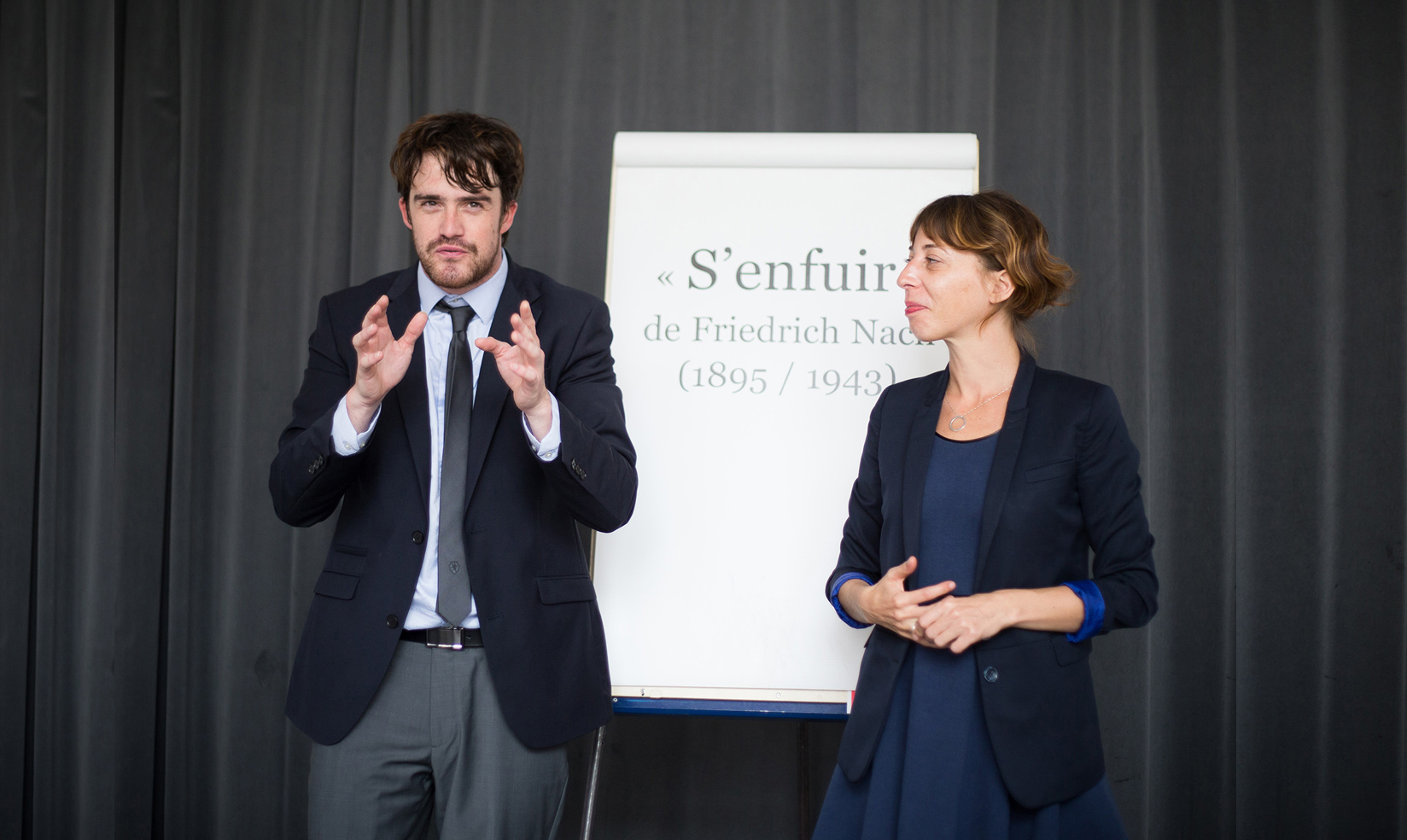 Puis comment parler de théâtre sans en faire une démonstration concrète. Alors nos deux meneurs s’infiltrent dans la peau des trois personnages d’une pièce de l’imaginaire Friedrich Nach, S’enfuir. Les morceaux sont pris au hasard pour illustrer les émotions, les décors, les costumes, la durée, la mise en scène… Et ils sont excellents dans tous les personnages qu’ils incarnent et pour faire vivre une histoire totalement farfelue autour d’un gâteau aux pommes. Lorsque nos héros s’embrassent avec passion, un silence s’est mi à régner dans la salle… c’était mieux qu’au cinéma.