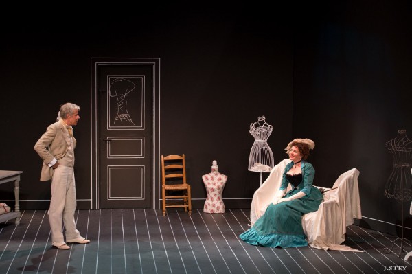 Agnès Boury, la metteuse en scène a eu cette idée suite à une discussion avec Sébastien Castro. Tous deux ont aimé le travail de Jean Poiret et surtout l’adaptation qu’il a pu faire en 1985 du Tailleur pour dames. Ils se sont dit pourquoi pas monter ce spectacle et demander Jean José d’interpréter le personnage principal. Une fois son accord donné, le spectacle peut commencer. Tout y jouer avec le ton juste et le dynamisme nécessaire. Mais voilà, j’ai eu du mal avec les décors. Qu’est-ce que ce fond blanc ou noir avec de simples traits? Pourquoi faire des costumes d’époque, des meubles d’époque et se limiter dans un décors aussi simpliste? Le spectacle Georges et Georges avaient déjà fait quelque chose de semblable mais beaucoup plus travaillé. Pourquoi avoir fait l’économie d’un peu d’ingéniosité sur le fond? Et quand le fond est noir, pourquoi faire une surface sur laquelle on peut écrire dessus à la craie? On n’est pas dans une émission de Valérie Damidot.