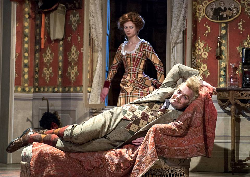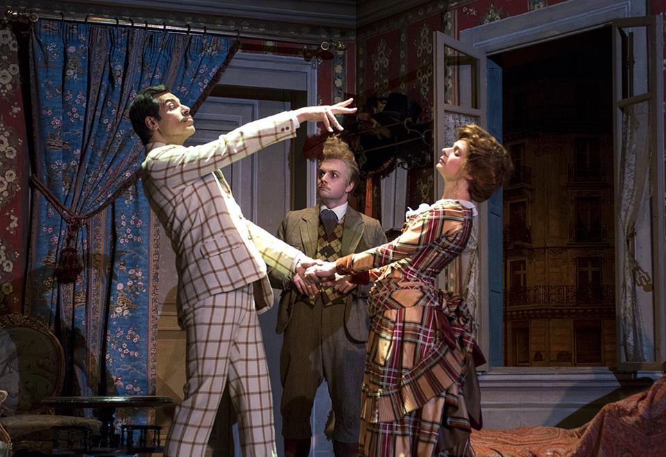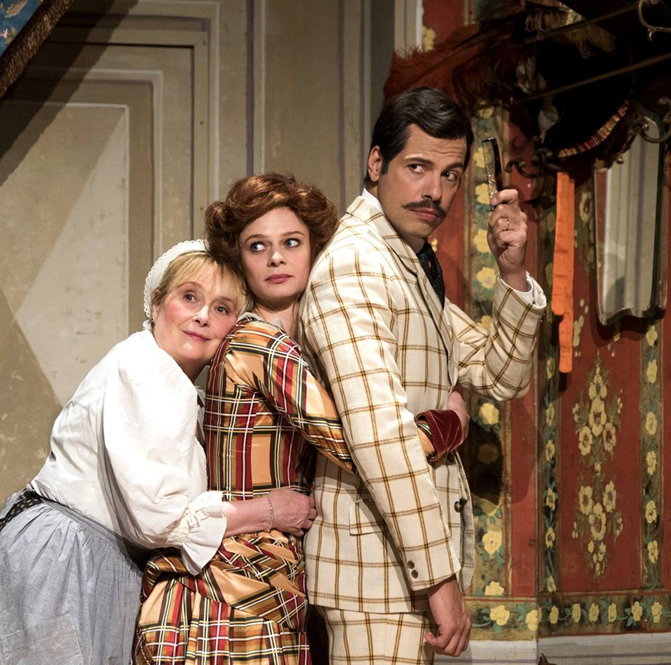 Pour montrer le génie humoristique de l’auteur, Muriel Mayette-Holtz, ancienne administratrice générale de la Comédie-Française, avait choisi Zabou Breitman pour mettre en scène cette histoire. C’est avec beaucoup d’élégance et de portes qu’elle donne une dimension comique. Le talent des comédiens aidant beaucoup également. Le spectacle commence avec la vue sur l’entrée du Vieux colombier, très charmant clin d’œil, magnifique décors de Jean-Marc Stehlé. Gusman vient mettre son échelle pour séduire sa belle, travaillant dans un appartement bourgeois à l’étage. La scène s’ouvre et nous voici plonger dans l’appartement bourgeois joliment décoré avec un très grand portrait de Robineau.