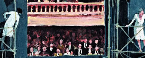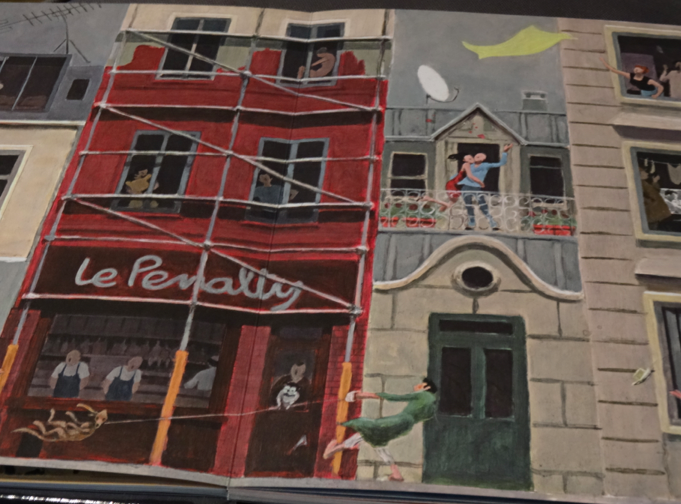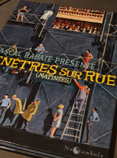 J’ai adoré le contraste entre la couverture et l’intérieur. La couverture montre des spectateurs vu à travers les fenêtres de la rue vue de derrière. Ainsi on découvre un décor de théâtre avec les techniciens qui font les ajustements. Puis l’intérieur, on se place comme le spectateur et on regarde ce qui se passe. Très ingénieux M. Rabaté tout comme le choix de l’acrylique permettant de superposer des couches de teintes donnant ainsi un aspect particulier très réussi. Et ce format que je ne connaissais pas que j’ai pris plaisir à plier et déplier pour mieux voir.