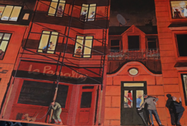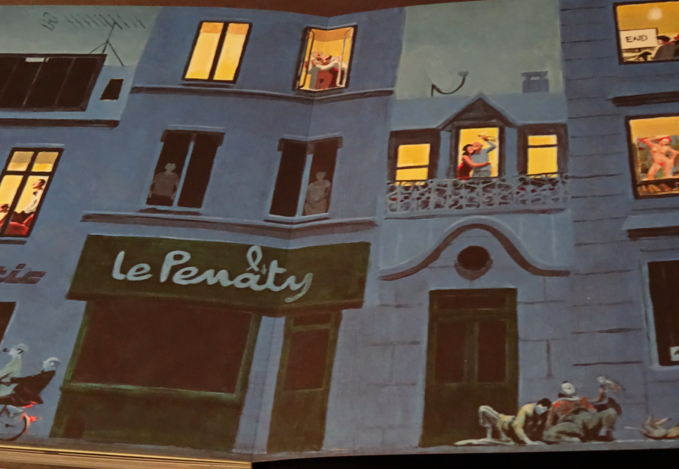 Nous sommes observateur de l’immeuble d’en face. On y voit apparaître et disparaître des habitants, des passants et des artisans qui suggère des intrigues amoureuses, créatives et meurtrières. Impossible de ne pas faire le rapprochement avec le film Fenêtre sur cour,d’Alfred Hitchcock surtout lorsqu’on voit l’ombre du maître planée parfois sur un mur où au détour de la rue. On rencontre aussi M. Hulot qui passait par là.