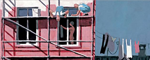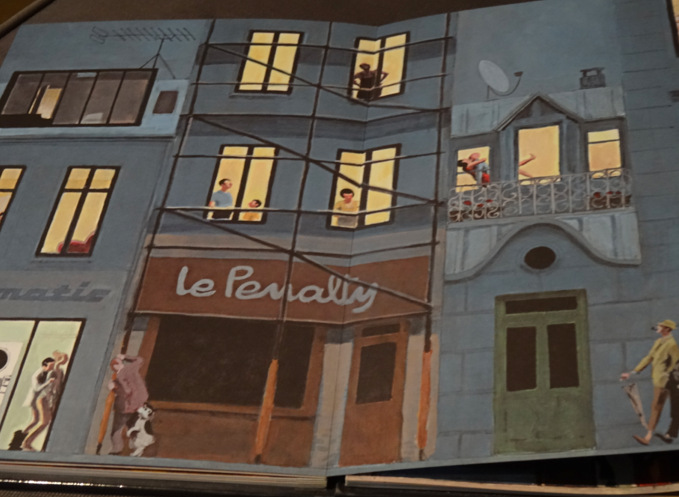 Le plan large et fixe nous montre une dizaine de fenêtres où l’on trouver au rez-de-chaussée une laverie automatique et un bistrot. Les vingt tableaux de vie, sans parole illustrent au recto les matinées et au verso, les soirées. J’ai pris le temps de tout bien regarder, de faire attention aux détails, où se dévoilent les intimités suggérées.