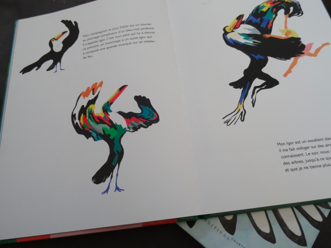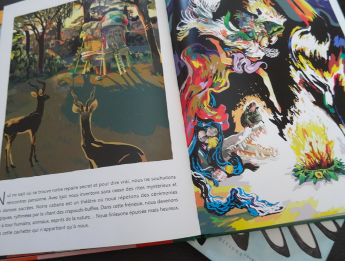 Un magnifique récit qui renvoie au monde de l’enfance où tout est possible, il ni a pas de limite et pas d’interdit. Un vent de liberté et d’aventures souffle à chaque page avec les couleurs qui remplissent tout l’espace. Il faut dire que cela contribue à l’histoire qui est un véritable coup de cœur aussi bien en librairie qu’en médiathèque. D’ailleurs, ils n’en manquent pas des couleurs car elles sautent aux yeux partout. Un peu trop à mon goût car à force de vouloir regarder les détails, j’avais mal aux yeux. J’ai adoré le récit avec cette fin toute gentille.