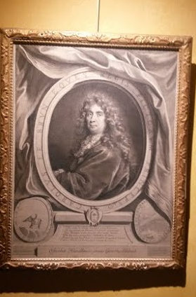 La visite débute avec dans la pièce réservée à la lampisterie (métier de mettre de l’huile dans la lampe à huile). Les murs jaunes sont recouverts de gravure. La guide attire notre attention sur deux portraits. Le premier, celui d’André Le Nôtre, fils et petits-fils de jardinier. Le plus important de sa carrière se fera dans le jardin de Versailles. Le second, est celui de Charles Le Brun qui a suivi une formation en Italie. Elle lui a permis de découvrir de nouvelles techniques, de nouvelles couleurs et de nouvelles créations qui lui ont permis de créer des décors d’exception au sein du château de Vaux-le-Vicomte.