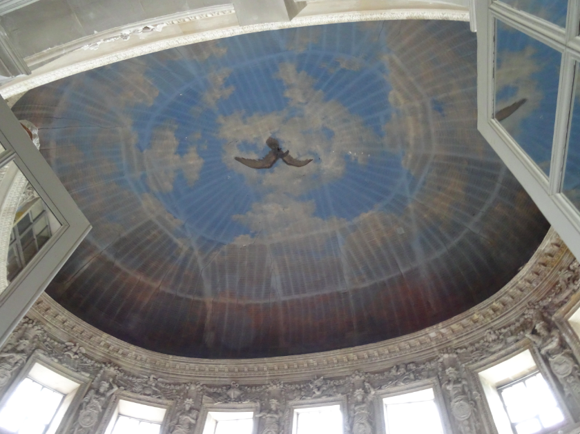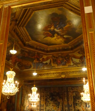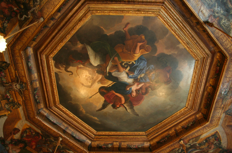 Le plafond est peint et sculpté. C’est la première fois que cette technique est utilisée et se retrouvera bien entendu à Versailles. On peut voir le pied d’un ange dans le vide, comme des ailes ou autres éléments en stuc.