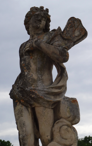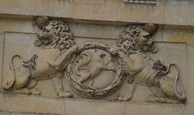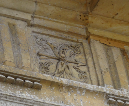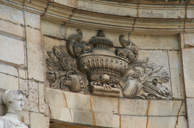 Le fronton est maintenu par 4 colonnes baguées. A droite du fronton, on voit la déesse de la moisson et à gauche, Apollon (symbolise le pouvoir de Nicolas Fouquet).