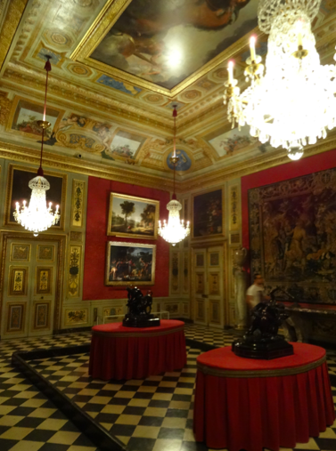 L’avantage, c’est qu’après la visite guidée nous pouvons rester dans le château et revoir les pièces visitées et voir les autres non commentés. Il ni a aucun cartel dans le château, alors certaines gravures ou peintures n’ont pas d’informations, ce qui peut être dommage. Mais combien de personnes lisent les cartes ? Peu selon les études. Par contre deux points positifs dans la muséographie. Dans chaque pièce, une feuille A4 précise que sont les objets et de quand ils datent. Et dans toutes les espaces du premier étage, dans un cadre doré, une petite feuille retrace l’historique des fonctions. Ces éléments permettent d’avoir un regard plus juste de l’occupation les espaces selon les époques.