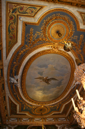Le plafond n’a pas été terminé. Il était prévu d’être représenté le temps du soleil. Un serpent passe autour des personnes, qui se mord la queue. C’est un signe d’éternité. La décoration resta pendant deux siècle de plâtre, jusqu’à ce qu’en 1844/45, où le duc de Choiseul-Praslin demanda au peintre-décorateur Dutenhoffer de chiffrer la réalisation initiale. La jugeant trop onéreuse, il laissa livre champ à l’artiste pour sa création et ce fut « un ciel avec des aigles aux ailes déployées » qui resta jusqu’à nos jours.