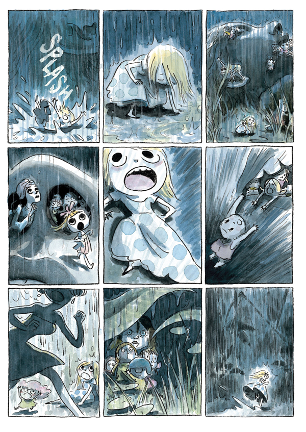 La couverture bleu glacial vous donne l’ambiance de cette bande dessinée très particulière. Et si le doute viendra à votre esprit, le titre Jolies ténèbres dans une police douce vous préviens. Vous n’allez pas entrer dans un monde gentil et onirique. Bienvenue dans un monde cruel et sans pitié.