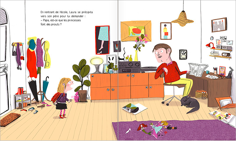 Une dispute à l’école a eu lieu entre Laura et ces petits camarades. Est-ce que les princesse pètent? Son père un peu surpris par la question va répondre de façon très sérieuse à la question. Bien entendu que les princesses font des pets et il va lui prouver avec un livre très particulier qu’il conserve dans sa bibliothèque. Dans Le livre secret des princesse on peut trouver tous les secrets des princesses du monde entier. C’est normal alors que l’on trouver une rubrique Problèmes gastro-intestinaux et flatulences. Et là, on va découvrir de terribles secrets. Cendrillon a fait un gros prout au moment des douze coups de minuits ou Blanche-Neige n’a pas eu le temps de manger la pomme car elle s’est auto-asphixiée avec l’odeur de son pet. Laura est rassurée et contente de connaître bien des secrets.
