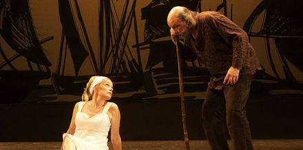 C’est dans un décor relativement sobre, que nous allons à la rencontre de Diogène. A gauche de la scène, un tonneau où il va vivre toute sa vie et au loin, une berge avec l’image d’un port qui varie de teinte selon la lumière du jour. Diogène n’est pas un philosophe ordinaire, il est cynique. D’ailleurs, il a suivi les enseignements d’Antisthène qui est venu le voir avant de mourir. Il parle au passant et pousse les gens dans leurs retranchements. Il a eu des élèves aussi qui n’apprécie pas beaucoup car il les houspille souvent et les traite de porc. Cratès et son épouse Hipparchia viennent l’ennuyer et parfois lui réclamer pitance.