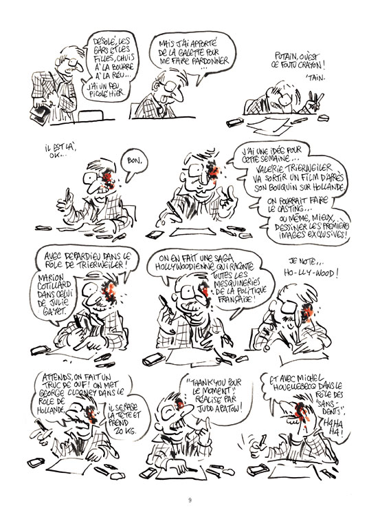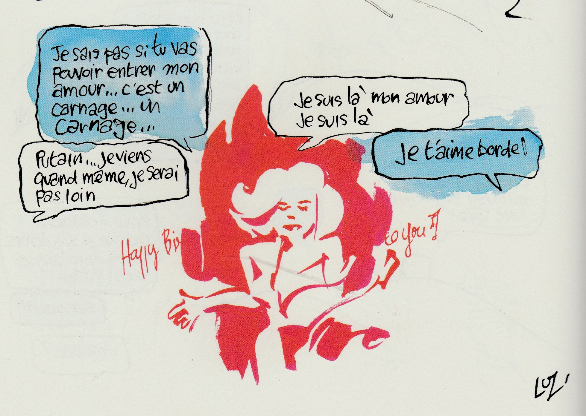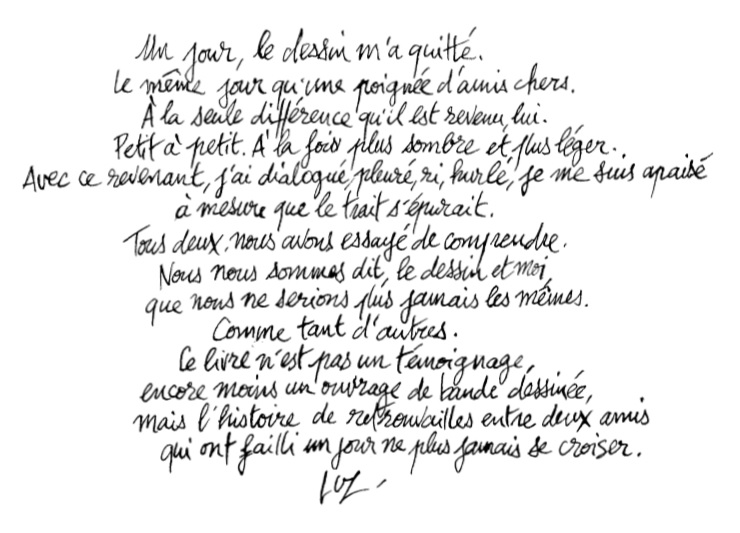 Luz dit qu’il ne fait pas une bande dessinée. Il ne définit pas le support de son album. C’est à la fois journal intime, un carnet de croquis, une touchante déclaration d’amour et une bouffée d’espoir qui entremêle le sexe et les larmes. On retrouve son mordant lorsqu’il se moque des complotistes, des extrémistes… Il ne faut pas y voir une basse vengeance en mots et en images, mais un cri d’un survivant qui souffre et qui aime. Car il faut dire que c’est une magnifique déclaration d’amour à sa femme qui est là pour lui et qui le soutient avec sa patiente et sa tendresse.
