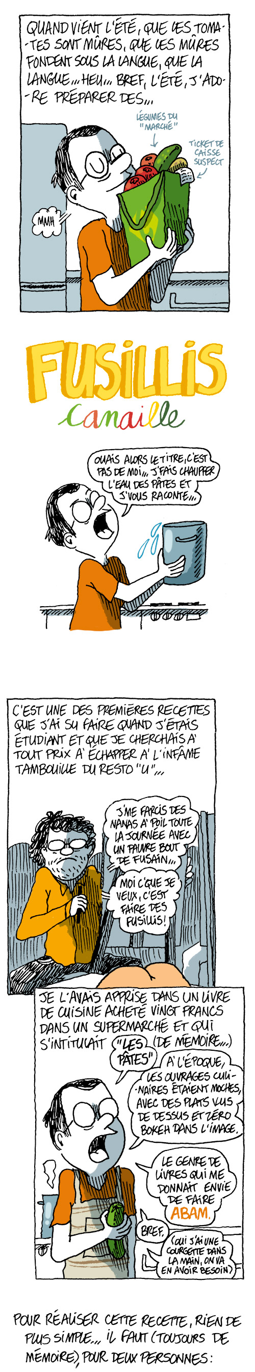 Attention, il ne faut pas toujours l’apologie de la bonne bouffe. Il donne aussi des conseils à l’enfant ou l’adolescent qui se refuse à manger avec les «10 réponses toutes prêtes pour quand on t’oblige à manger». Il propose des repas pour épater ces potes qui vous croient pas trop capable de cuisiner comme le tartare de saumon et sa salade de radis noir et aussi apprend des termes pour briller en société comme puxisardinophilie. Une bande dessinée qui se lit doucement pour bien faire attention aux recettes surtout si on veut les tester en simultanée. Il propose aussi des recettes de famille et de ces amis qui expliquent comment faire. Vous ne pourrez être que conquis par cette bd qui met l’eau à la bouche.