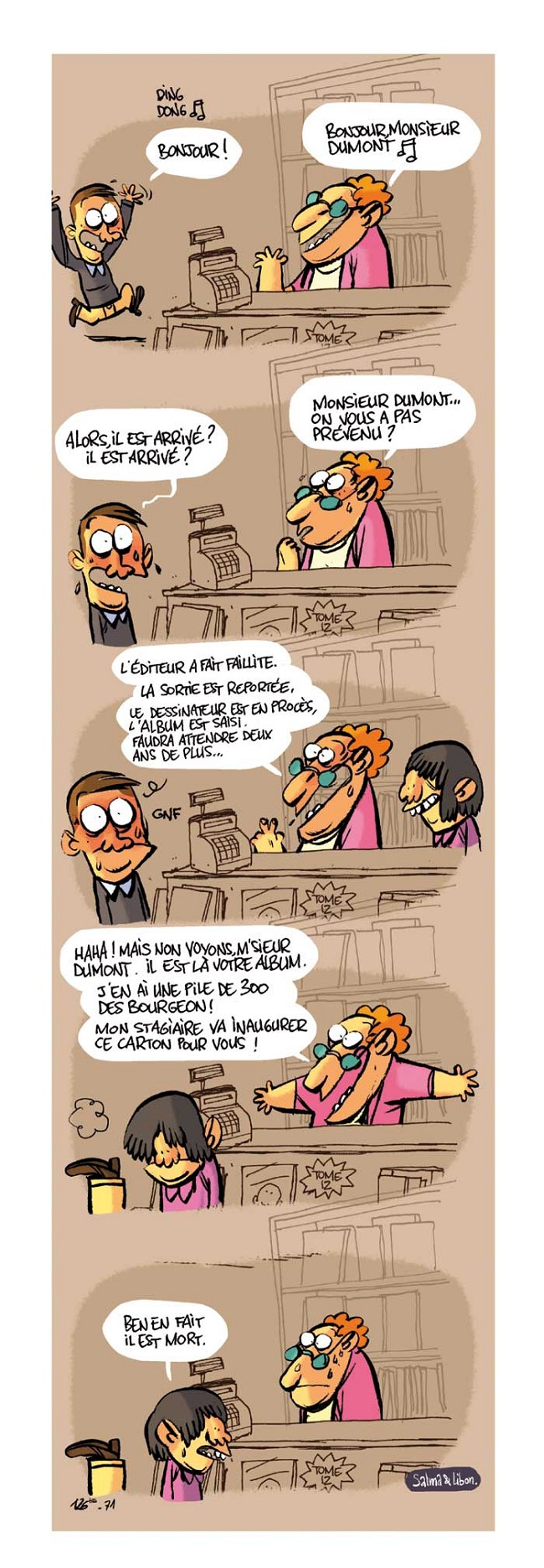 Le lecteur de bande dessinée est un être particulier. Le patron de la boutique doit faire face à bien des énergumènes. Il rencontre le passionné qui attend avec impatience le nouveau tome de sa série qu’il aime tant. Le lecteur qui pour lui, la vraie bande dessinée était celle des années 80 et que depuis, on ne fait rien de mieux. Ils y a ceux qui veulent bien découvrir des nouveautés mais ils sont tellement exigeants qu’ils ne trouvent rien. Et il y a aussi la quantité de publication qui noie souvent le patron qui doit trouver de la place pour laisser de la chance à chacune. Il va d’ailleurs même aller en mettre chez son voisin le pharmacien par manque de place.