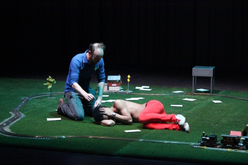 Le jeu des comédiens surtout celui de Pierre Lefebvre, qui incarne le personnage principal, est parfait avec une grande harmonie. Citons-les tous : Juliette Poissonnier, Sébastien Bravard ,Nathalie Vairac, Bernadette le Saché, Mireille Roussel, Laurent Montel, Laurent Ménoret, Tadié Tuéné. Je mettrais toutefois un bémol aux moments de danse qui manquent cruellement d’osmose et de magie. J’avais l’impression de voir des gens contraints de faire une action qu’ils n’appréciaient pas. Pas pour tous bien entendu, mais cela donnait l’impression d’amateurisme et de souffrance. Pierre Lefebvre lui semblait très à l’aise dans son corps pour faire toutes les acrobaties nécessaires même pour nous parler de théories mathématiques.