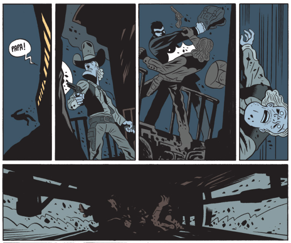 C’est avec des références au cinéma américain que cette histoire nous est racontée. Les plans, les cadrages, la physionomie des personnages réalisés par Brüno, le choix de teintes de Laurence Croix et le texte très précis de Fabien Nury, tout est bien étudié pour en faire une bande dessinée exceptionnelle. Tyler Cross est digne de bien de gentils-vilains qui peuplent le cinéma et la littérature américain. Tous les détails y sont et l’histoire se lit avec une rapidité surprenante. J’ai fait un bond dans mon imaginaire qui y a vu bien des références. Cela ne m’aurait même pas surprise de croiser Clint débarquer en plein désert avec une de ces belles demoiselles en détresse.