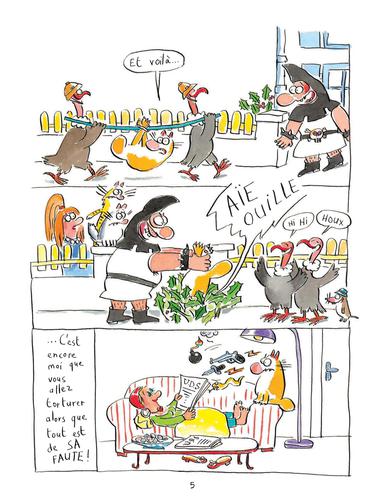 En plus l’univers graphique est très naïf et se rapproche d’un dessin que pourrait réaliser un enfant (avec tout de même plus de précision). Les traits ne sont jamais droits. Les personnages sont un peu grossiers avec des gros nez comme les personnages de Florence Cestac. La mise en couleurs est approximative et des fonds bien souvent blancs. Rien n’est trop chargé afin de permettre aux jeunes lecteurs de se concentrer sur l’histoire et de ne voir que l’essentiel.