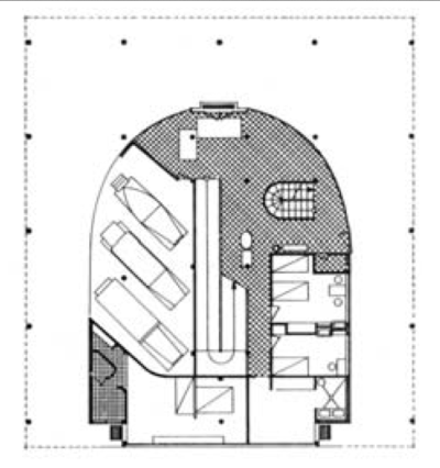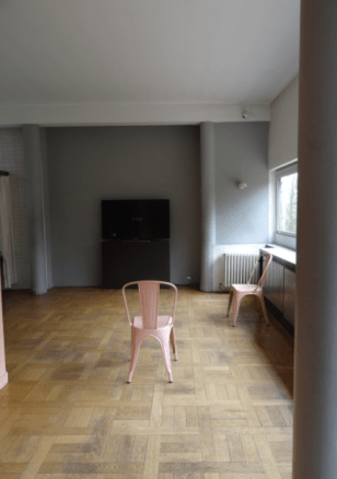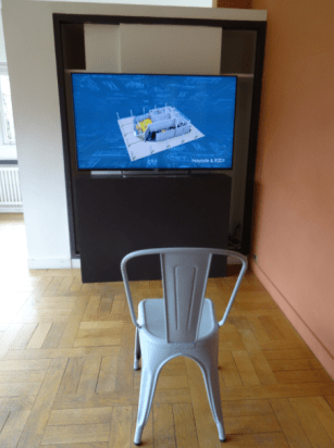 Il n’y a aucun mobilier dans l’espace. Quelques vidéos montrent des exemples d’aménagement avec des fauteuils confortables, quelques tables et chaises qui devaient changer si des invités étaient ou non présents.