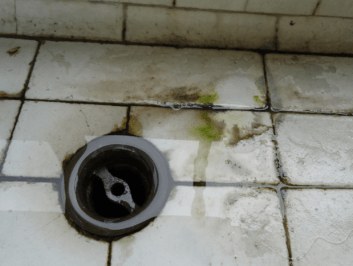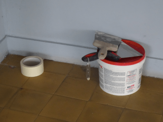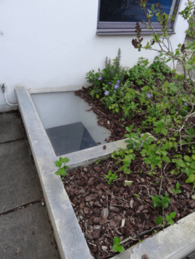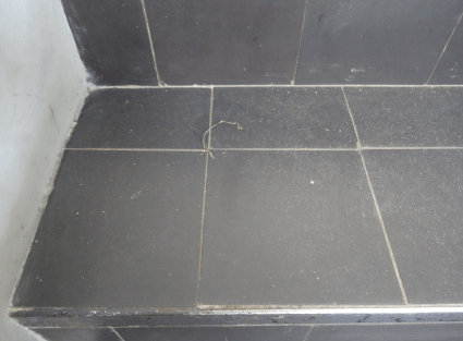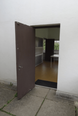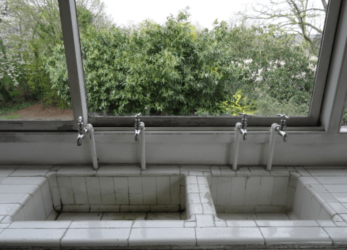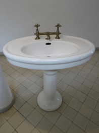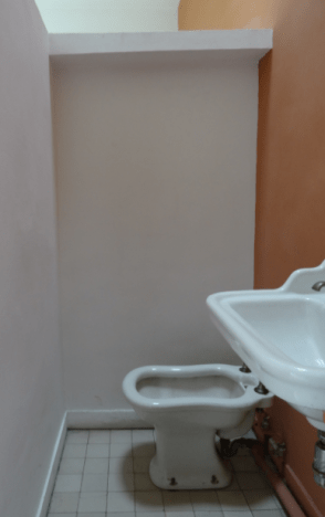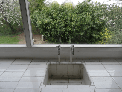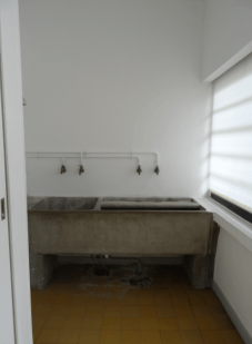 A proximité de l’entrée, se trouve aussi un lavabo qui pouvait permettre aux personnes arrivant de se laver les mains et à côté une tablette en béton intégré où l’on pouvait poser des serviettes ou autres.