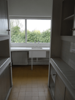 La cuisine est attenante à la salle de réception. L’endroit est vraiment pensé très pratique, hygiénique et très moderne. Tout est carrelée avec des carreaux de céramique blanche (comme le métro parisien) et équipée de rangements aux portes métalliques.
