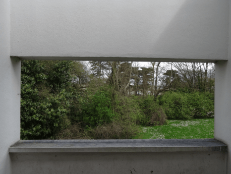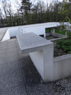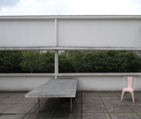 Lorsqu’on monte la rampe vers le solarium, un point de vue nous est imposé. Un cadre qui nous plonge au coeur de la campagne des années 30 sous les Savoye et vers l’urbanisme pour l’être moderne que nous sommes.