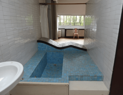 La vague à proximité de la baignoire n’est pas sans rappeler un siège célèbre de Charlotte Perriand.