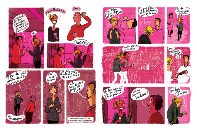 Le dessin, plein d’aplat n’est pas sans rappeler celui que l’on trouve dans la presse féminine, celle dans le packaging destiné à la consommatrice un peu branchée et enfin celui de la bd dite pour fille. Donc on peut dire que le coeur de cible est atteint. D’ailleurs, on y trouve les sujets habituels comme l’addiction à la mode et aux marques, le régime qui est difficile à suivre et que personne n’arrive à suivre et le culte de l’apparence. Bien entendu, rien n’est là pour vous inciter à changer de vie ou prendre des bonnes résolutions. La narratrice raconte ces tracas du quotidien pour faire rire et sourire.