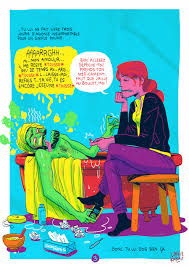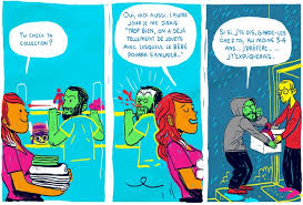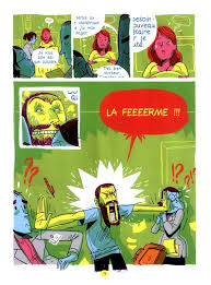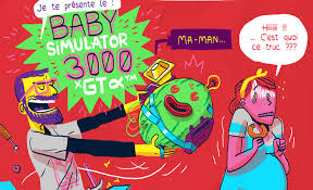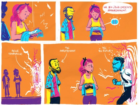 Ce que j’ai le plus aimé, c’est la mise en couleurs flashy. Traits épurés, décors sommaires mais les couleurs pop flashy sont partout. La rétine en prend plein. Au placard la ligne claire et bienvenue à la folie colorée. D’ailleurs, c’est cette énergie qui m’a fait choisir cette bd. Car le récit d’un geek 2.0, futur papa, en soit ne m’aurait pas trop intéressé.