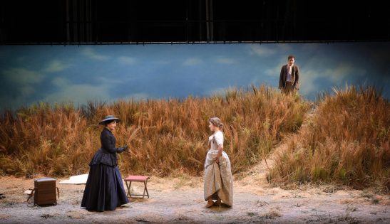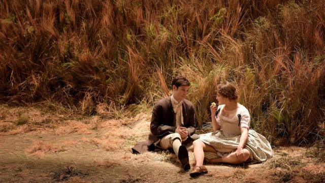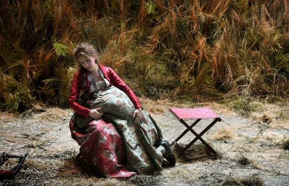 Clément Hervieu-Léger à la mise en scène et Eric Ruf à la scénographie réalisent une étonnante surprise visuelle. C’est un étonnant décors aux accents champêtres, une bute de verdure où les comédiens se déplacent, se couvrent, s’enfuient, se cachent… Toute l’histoire se déroule dans ce lieu qui ne bougent pas. Adieu les salons chargées, les servants qui apportent le café et bonjour la nature. Le fond de scène est visible. On voit les grands ventilateurs qui s’activent et créé un fond mouvant sur cette dune sablonneuse. Plusieurs chemins mènent de bout en bout de la scène, les personnages peuvent ainsi se croiser ou s’éviter.
