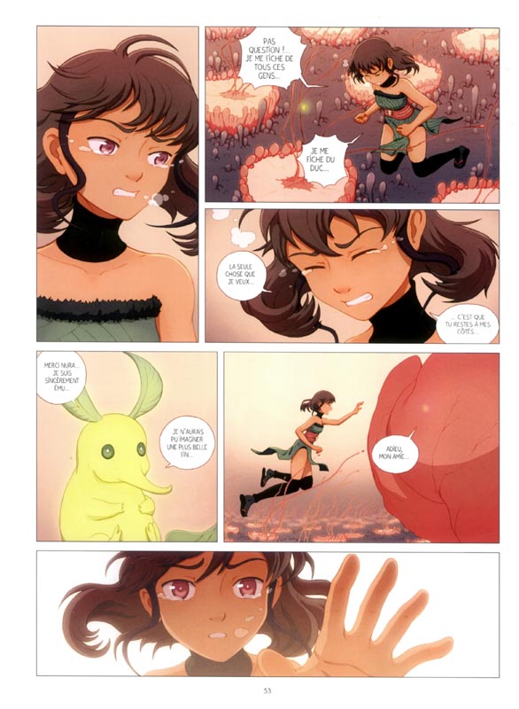 J’ai apprécié la lecture de cette bd car l’univers graphique aux couleurs douces est vraiment très bien réalisé. C’est un vrai régal pour les yeux. Par contre, je trouve l’intrigue se résout un peu trop vite. On passe presque de l’entrée de Nura dans le palais à son retour dans son chez elle, sur le sol en pleur. J’aurais aimé avoir un peu plus d’intrigue et pas forcément un happy end à la fin, au moins pour la vie au château. Mais ne faut-il préserver l’innocence de ces chères têtes blondes ? J’aurais tendance à dire non vu ce qu’ils voient à la télé et dans leurs jeux vidéo, un petit mort de les traumatisera pas. Ce choix n’a pas été fait ici alors restons quand même bienveillant.