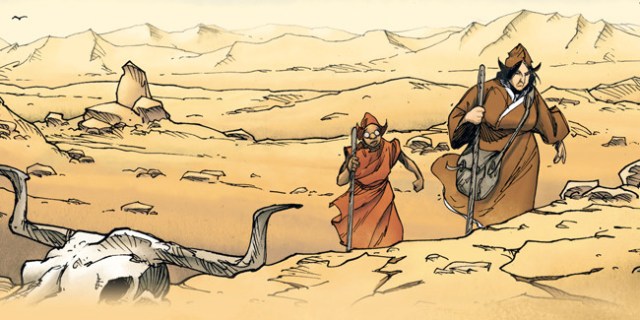 L’histoire de cette femme extraordinaire aurait pu être un récit linéaire où on suit son parcours de sa naissance en France jusqu’à mort à Digne. Mais l’angle choisi est bien différent. C’est à travers le regard de l’assistante d’Alexandra David-Néel que l’on va apprendre à connaître cette femme qui a déjà 90 ans. Marie-Madeleine Peyronnet mélange son quotidien avec la femme qui n’est pas facile à vivre avec les récits d’aventure. Fred Campoy et Mathieu Blanchot se sont inspiré de son livre de souvenirs publié en 1973, « Dix ans avec Alexandra David-Néel ».